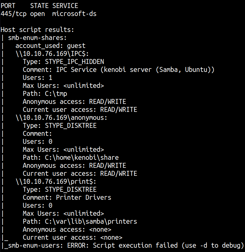nmap -p 445 --script=smb-enum-shares.nse,smb-enum-users.nse 10.10.76.169