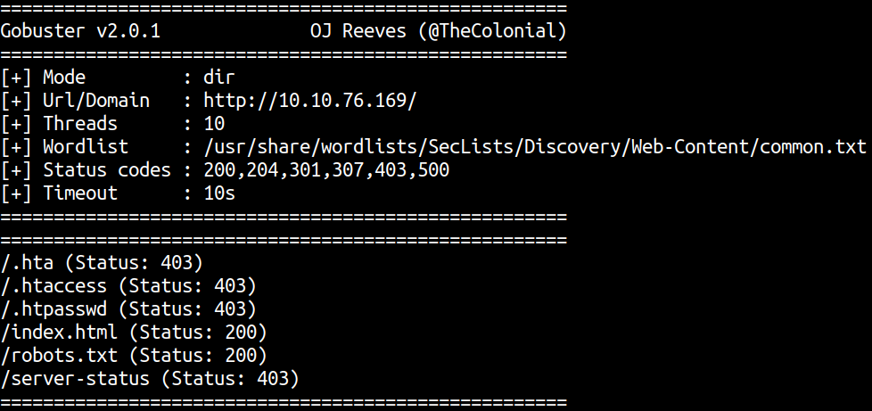 gobuster -w /usr/share/wordlists/SecLists/Discovery/Web-Content/common.txt -u http://10.10.76.169/ -s '200,204,301,307,403,500' 2>/dev/null