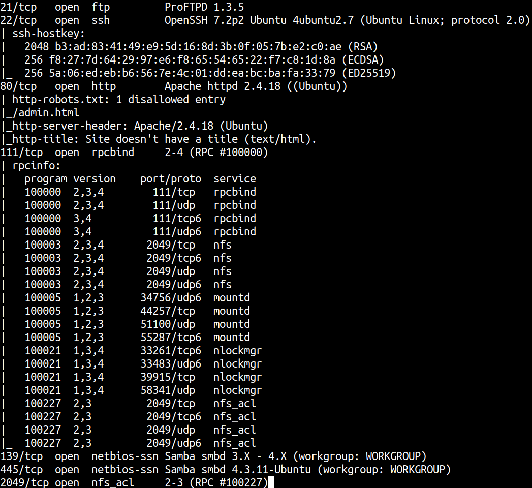 - Services: SSH (22), FTP (21), HTTP (80), SMB (139, 445), NFS (2049), 111 (RPCBind)