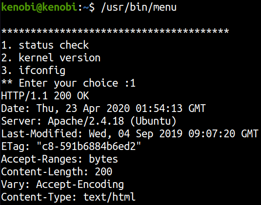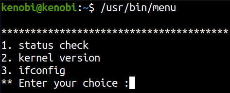We have to look for the odd file here like, /usr/bin/menu. If we run the binary we get this output with 3 options to select.