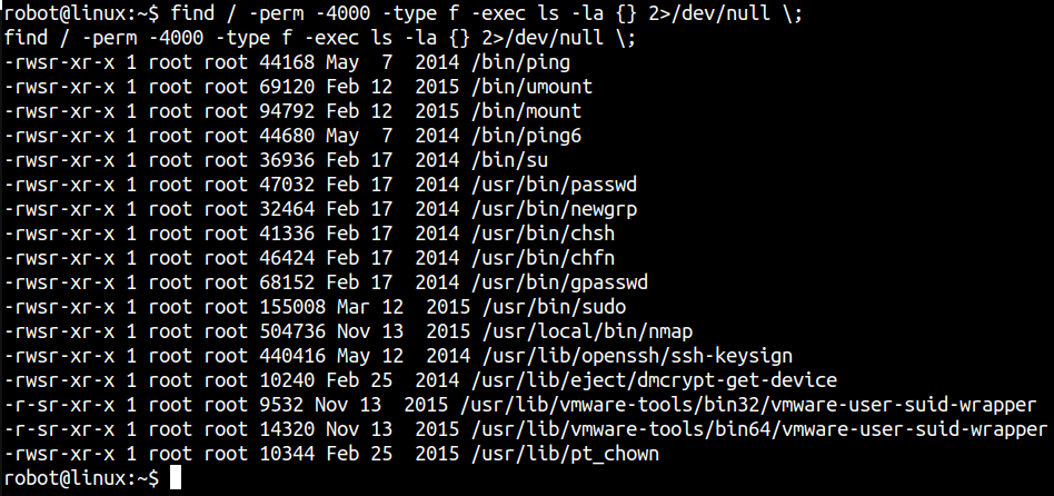 find / -perm -4000 -type f -exec ls -la {} 2>/dev/null \;