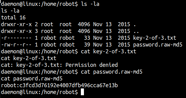 -rw-r--r-- 1 robot robot 39 Nov 13 2015 password.raw-md5