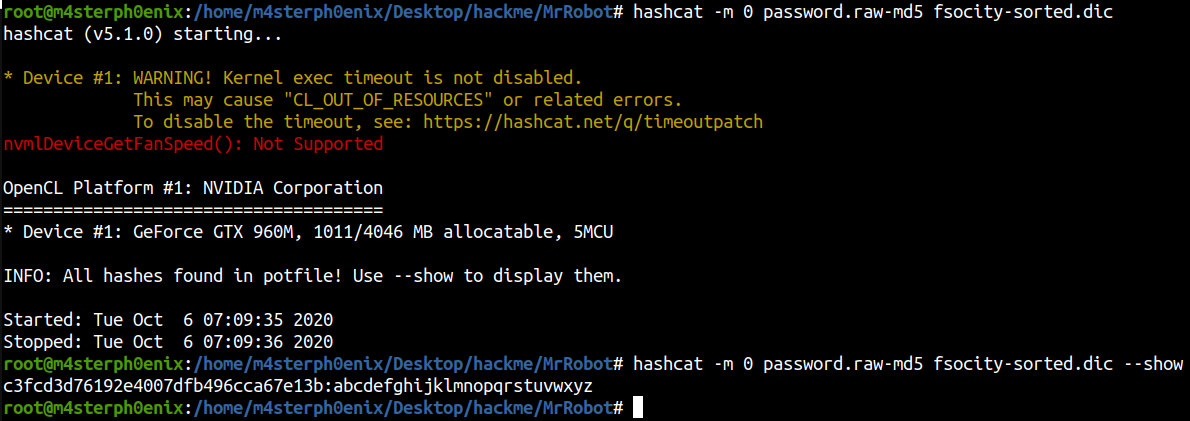 hashcat -m 0 password.raw-md5 fsocity-sorted.dic