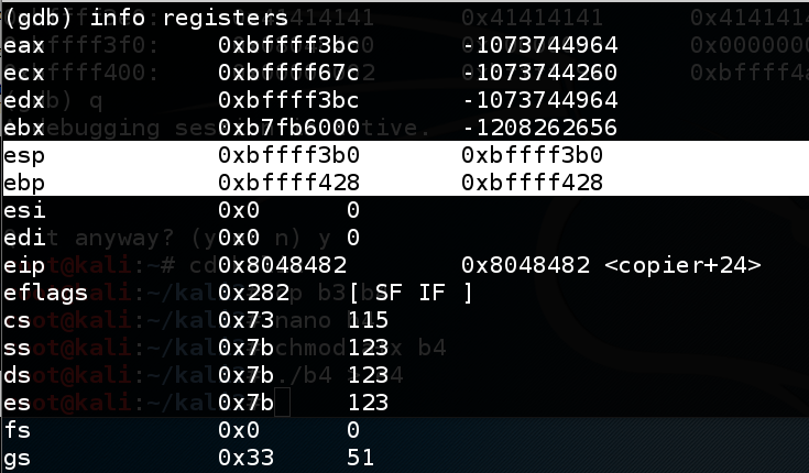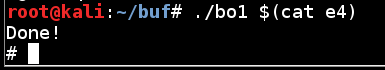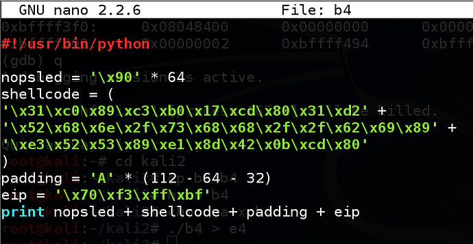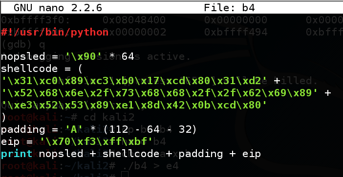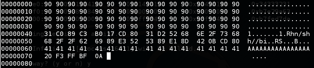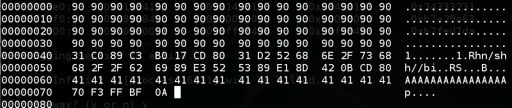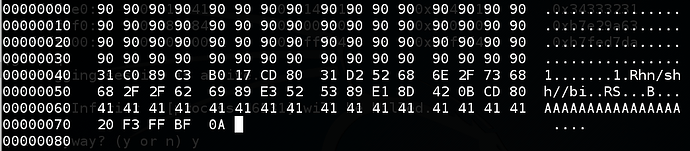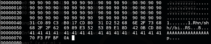When I did it with these values, the exploit worked in gdb but not in the real shell. That’s a common occurrence, and the reason for the NOP sled. If that happens to you, adjust the return value in the exploit file using hexedit until it works.