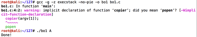 gcc -g -z execstack -no-pie -o bo1 bo1.c