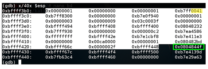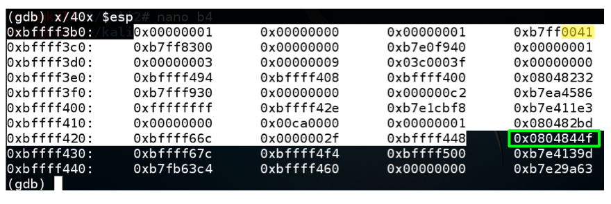 This command is short for “eXamine 40 heXadecimal words, starting at $esp”. It shows the stack. Find these items, as shown below: