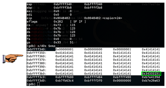 As you can see, the return address is now 0x34333231, as outlined in green in the image below.