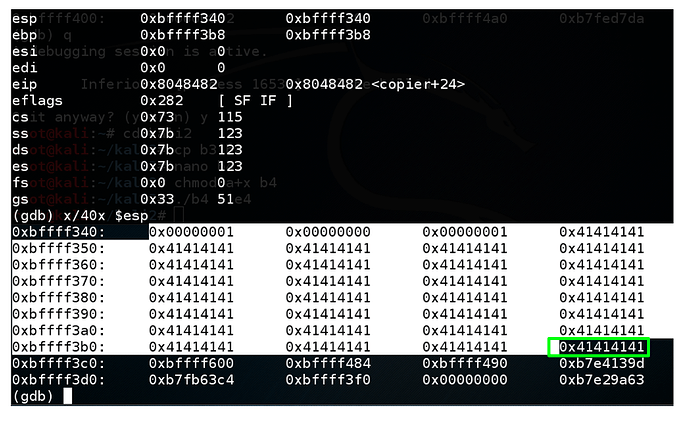 - The word in the green box is the first word after $ebp. This is the return address – the address of the next instruction to be executed after main() returns. Controlling this value is essential for the exploit.