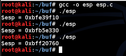To see what it does, we’ll use a simple C program that shows the value of $esp – the Extended Stack Pointer.