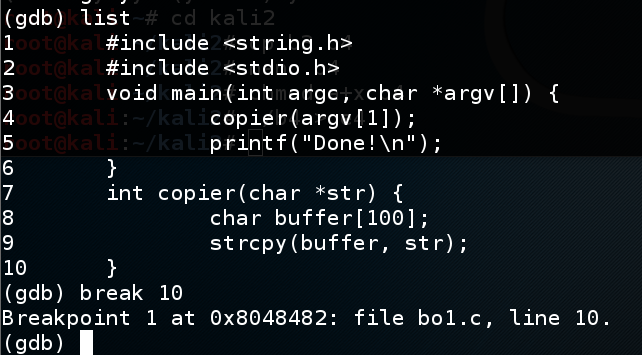 The “break 10” command tells the debugger to stop before executing line 10, so we can examine the state of the processor and memory. At line 10, the strcpy() operation is done, but the program has not attempted to return from copier() yet.