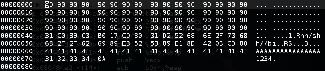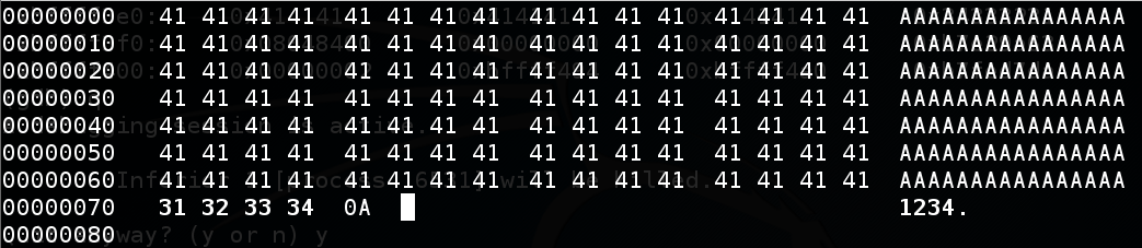 In the hexedit window, carefully change the last 4 ‘41’ bytes from “41 41 41 41” to “31 32 33 34”, as shown below.