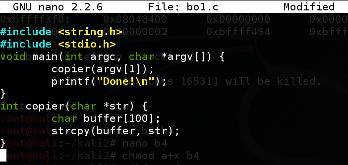 This program does nothing useful, but it’s very simple. It takes a single string argument, copies it to a buffer, and then prints “Done!”.