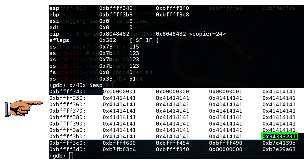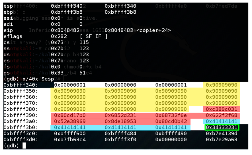 - The “A” characters–the “41” values after the shellcode (highligted in blue)