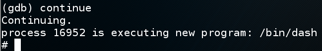 The exploit works, executing a new program “/bin/dash”, as shown below.