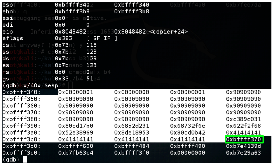 We need to change eip to 0xbffff370. However, since the Intel x86 processor is “little-endian”, the least significant byte of the address comes first, so we need to reverse the order of the bytes, like this: