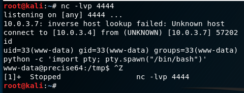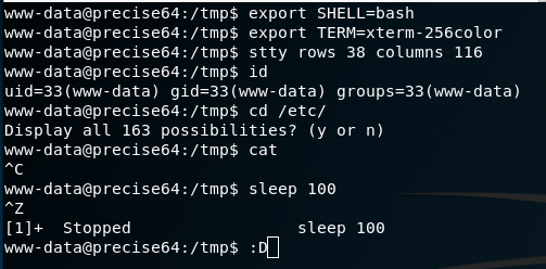 First, follow the same technique as in Method 1 and use Python to spawn a PTY. Once bash is running in the PTY, background the shell with “Ctrl-Z”